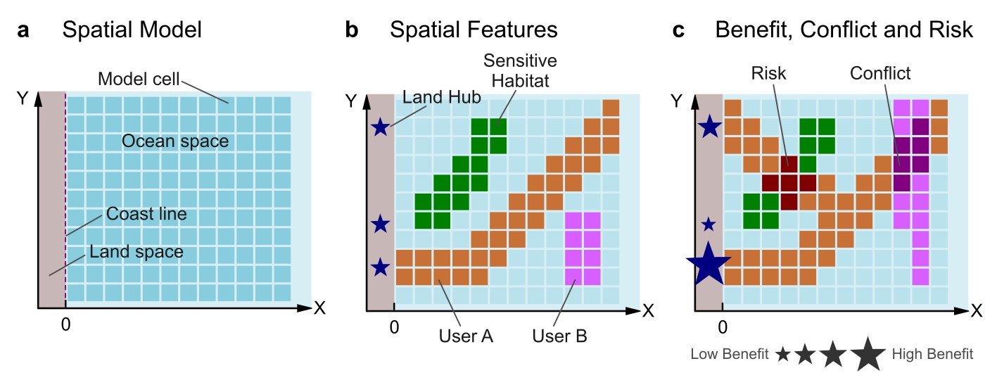 Conceptual representation of the spatial model in the PEM framework. The ocean and land areas are divided into a spatial grid, where land hubs, habitats, and users interact to generate benefit, risk, and conflict metrics that support integrated performance assessment and scenario simulation.#