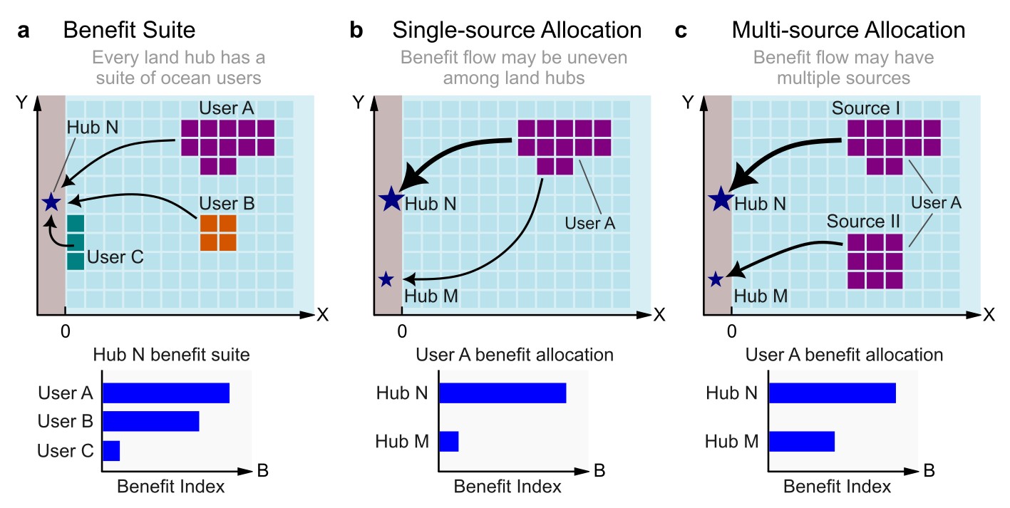 Elementos conceituais do Índice de Benefício. (a) Portfólio de benefícios: um hub recebe um benefício total composto por múltiplas contribuições de diferentes usuários. (b) Alocação de fonte única: um usuário contribui com benefício para um ou mais hubs a partir de uma única área oceânica. (c) Alocação de múltiplas fontes: um usuário com diversas áreas espaciais de origem distribui benefícios para diferentes hubs, formando uma estrutura de fluxo de benefícios mais complexa.#