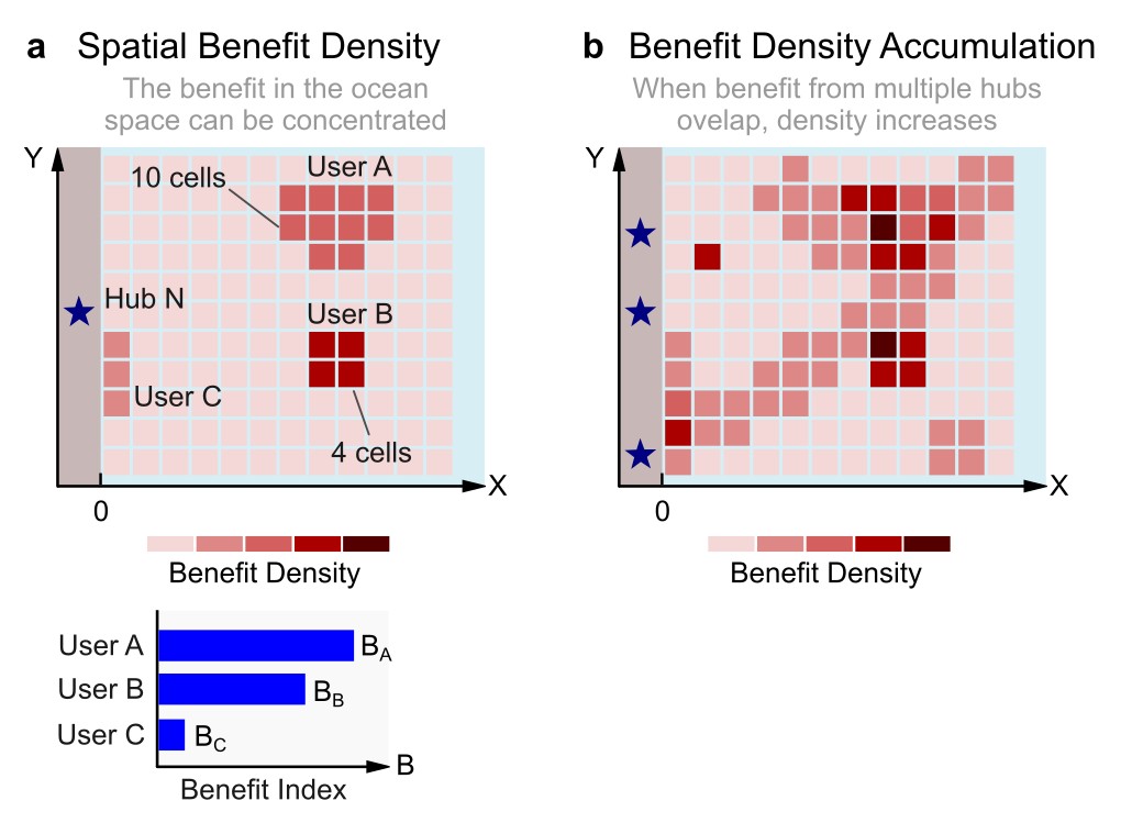 Once sources are defined, the Benefit Index concentrated at the hub can be translated into Benefit Density in the ocean space model, which expresses how much benefit is generated per unit area. Large source areas with modest benefit yield low density, while small yet productive areas produce high density. Thus, two sources may contribute the same benefit to a hub but differ sharply in density due to their spatial footprints. Benefit Density highlights how efficiently ocean space is used and helps identify activities that deliver high value with lower spatial pressure.