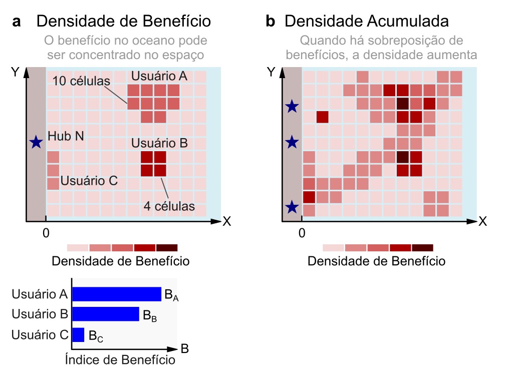 Mapeando o Benefício de volta ao oceano. (a) Conceito de densidade de benefício: cada usuário gera benefícios distribuídos espacialmente, cuja intensidade depende de quão concentrada ou difusa é a área oceânica que os origina, refletindo diferenças de eficiência espacial. (b) Mapas de densidade específicos e cumulativos por hub: cada hub possui seu próprio mapa de densidade de benefício; contribuições sobrepostas de múltiplos hubs ou usuários podem ser somadas por meio de álgebra de mapas, produzindo áreas de maior densidade de benefício cumulativa.#